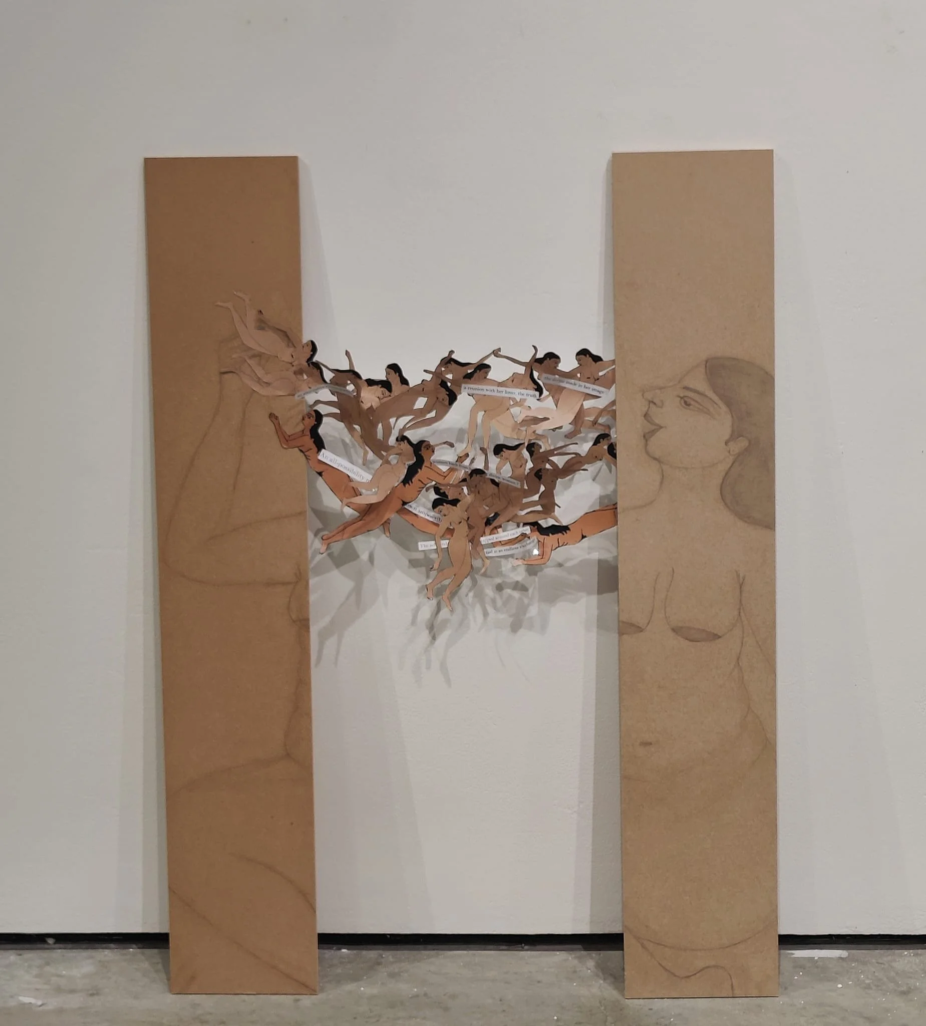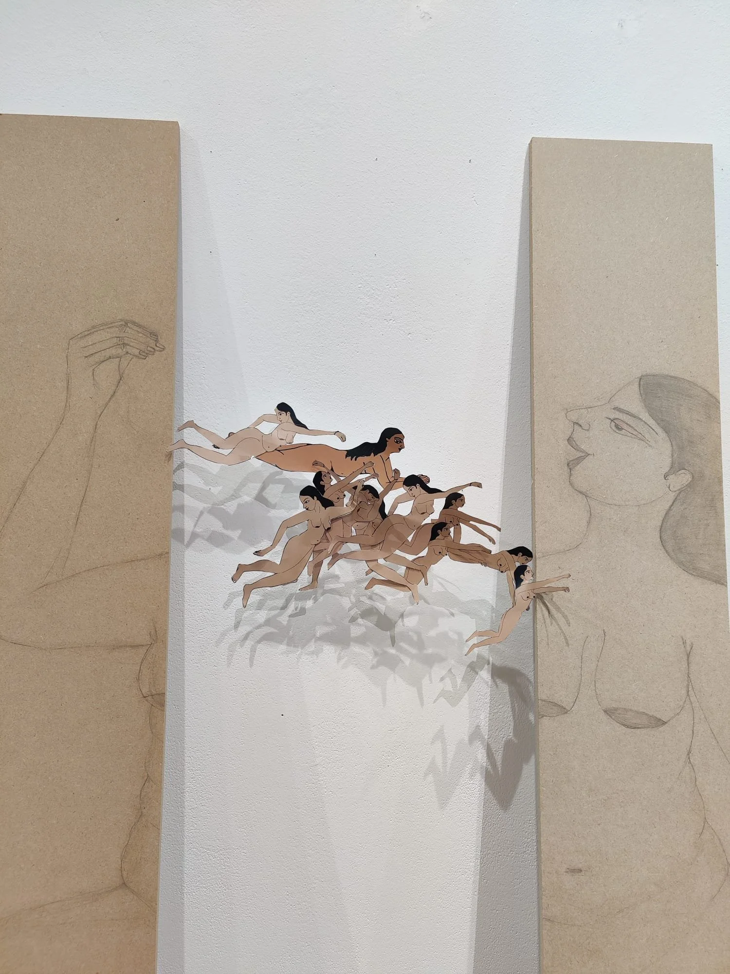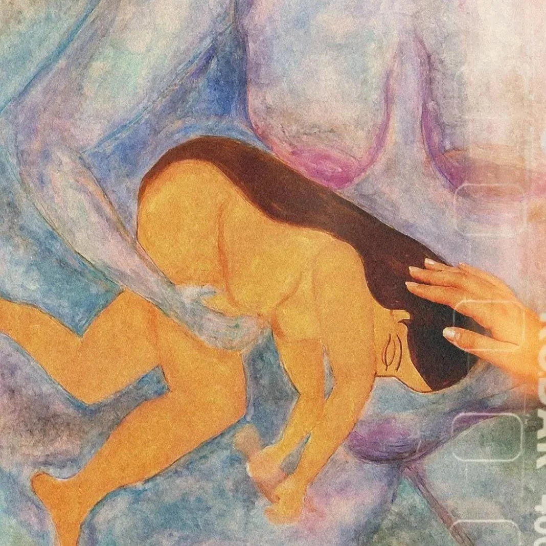 Threads weave a tale where women, suspended in a celestial dance, find themselves entwined within the embrace of a larger form. As they are seemingly consumed by her presence, a deeper unity unfolds—a narrative where the threads of life and mystery converge, hinting at both captivity and communion in the divine embrace.